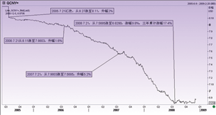 2008年上半年,人民币呈现明显的加速升值趋势,兑美元从7.30升至6.85,升值幅度6.56%。人民币对美元自汇改以来已经累计升值约18%,平均年升幅6%。自2005年7月21日到2008年7月21日整整三年中,人民币各年升幅分别为3.6%、5.2%和9.8%,呈现出单向、加速升值趋势。