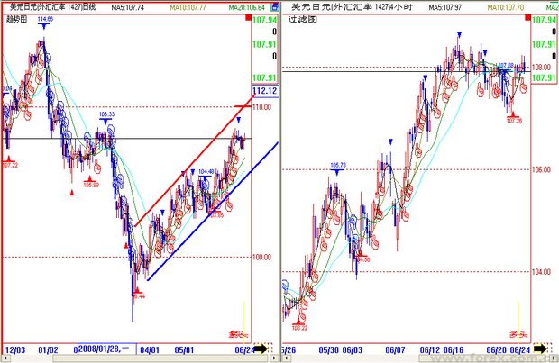 上周美元兑日元未能站稳于108后出现下跌.上周一公布的月度经济报告显示日本经济前景将低迷,4月所有产业指数好坏参半.预期套息交易将在本周继续左右日元,但数据亦不容忽视.若周三美联储利率决议确定将在9月份加息,那么将明显改变套息交易的情绪.就风险情绪变化而言,上周套息交易减仓帮助提振日元.另一个推动日元的因素是利率预期差异.市场预期日央行将维持不变,但美联储短期可能加息的声音越来越强烈.若伯南克就加息发表强硬讲话或只是旨在吓唬市场,那么投资者将获得更清晰明了的方向.技术图表所见,近期美元兑日元失守于108支撑后一度出现滑落,在淘金指趋势图中,最新出现一个向下三角形信号,相对应地过滤图则出现向上手指,反映目前汇价于109附近遇到阻力,但短线进一步上行的欲望仍较强,图表中汇价上档压力较大,预计其后市进一步走高后将有受阻回调的风险.