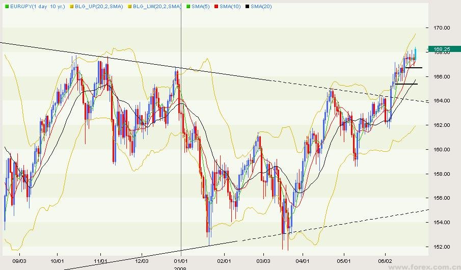 走势与我们上周预期几乎一致。汇价上周回撤至前期盘整区间顶部後,再次盘整,形成新的盘整区间。本周二汇价在区间底部得到支持後重新获得上行动能而走高。若今日收盘在最新的盘整区间顶部上方或者附近,则更有利于进一步的上行。纵观均线方向,汇价仍倾向上行测试前期历史高点169.12。不过细节上,本轮升势跌跌撞撞,显示多头的力量差不多油尽灯枯。汇价上行破败的风险较大。在当前位置,建议短线逢低买入,紧设合理止损。稳健的投资者也可以暂时观望,关注汇价在169.10附近的动能变化,根据当时形势选择逢高卖出或者突破後买入,走势显示前者的概率更高。