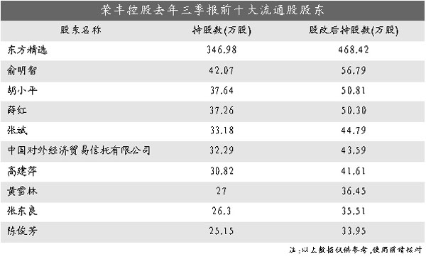 1月23日,S武石油复牌,证券简称变更为荣丰控股。当日,荣丰控股的开盘价为10元,盘中曾一度冲高到15.15元,全天成交额达到了3.71亿元,创下成交天量。深交所有关数据显示,当日卖出的第一大成交量就是机构席位,卖出的金额达到了3655.6万元。以荣控股份最高价15.15元和最低价10元来计算,该机构席位卖出的数量将在241.29万股至365.56万股。翻阅荣丰控股的前十大流通股股东,东方精选以300多万股的持股比例遥遥领先。第二流通股股东为俞明智,持股数量仅仅只有42.07万股,不难看出,在S武石油股改完成复牌当日,大幅抛售荣丰控股的机构只能是东方精选。