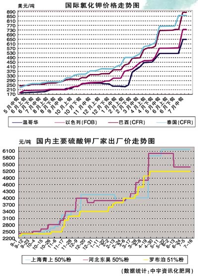 今年进入3月份以来,钾肥市场价格呈现快速上涨态势。根据中国化肥信息网的统计,2007年10月份,国内白钾港口交货价为2250元/吨,2008年1月份3300元/吨,2008年3月份3600元/吨,4月份4000元/吨,直到7月达到5000元/吨。