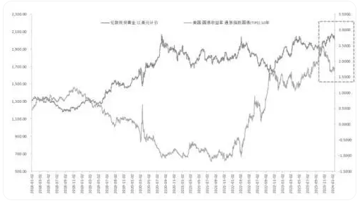 图为美国10年期通胀保值国债(TIPS)与伦敦现货金价(单位:美元/盎司)走势对比