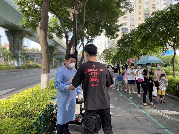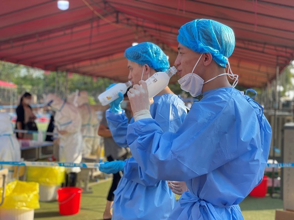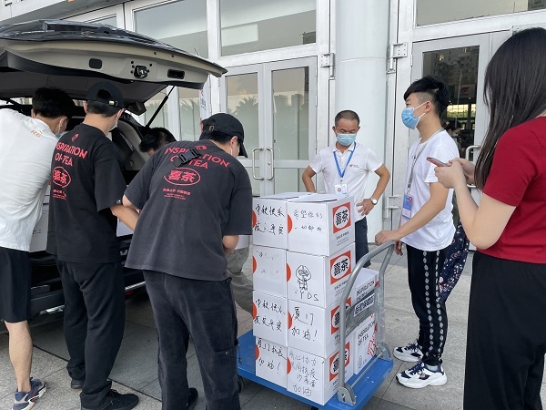 图注:9月16日,喜茶向东海中学核酸采样点工作人员共计赠送气泡水及果汁茶20箱