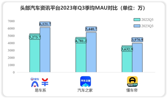 易车App则是易车旗下集汽车资讯、报价、车友社区、汽车服务于一体的综合汽车服务平台。知名移动大数据服务商极光大数据发布《2023年Q3移动互联网行业数据研究报告》及数据显示,三季度包括易车App和易车汽车报价App在内的易车系移动应用MAU达到6121.7万,同比增长16.08%,增幅在头部平台中居首,也自2020年四季度以来连续12个季度位居行业第一。另据移动互联网商业智能服务商QuestMobile数据显示,三季度易车系MAU高达7163.80万,同样位居行业第一。