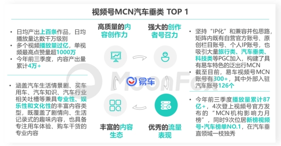 通过构建这样多主体供给,多类型覆盖,涵盖主流汽车消费、生活场景的视频内容体系,易车打造了汽车垂直领域的视频生产、分发“中央厨房”。易车也以“视频化”为战略支点,全面升级内容体系,构建连接用户、自媒体与厂商、经销商的内容新生态,引领并推动汽车内容行业的视频化转型。