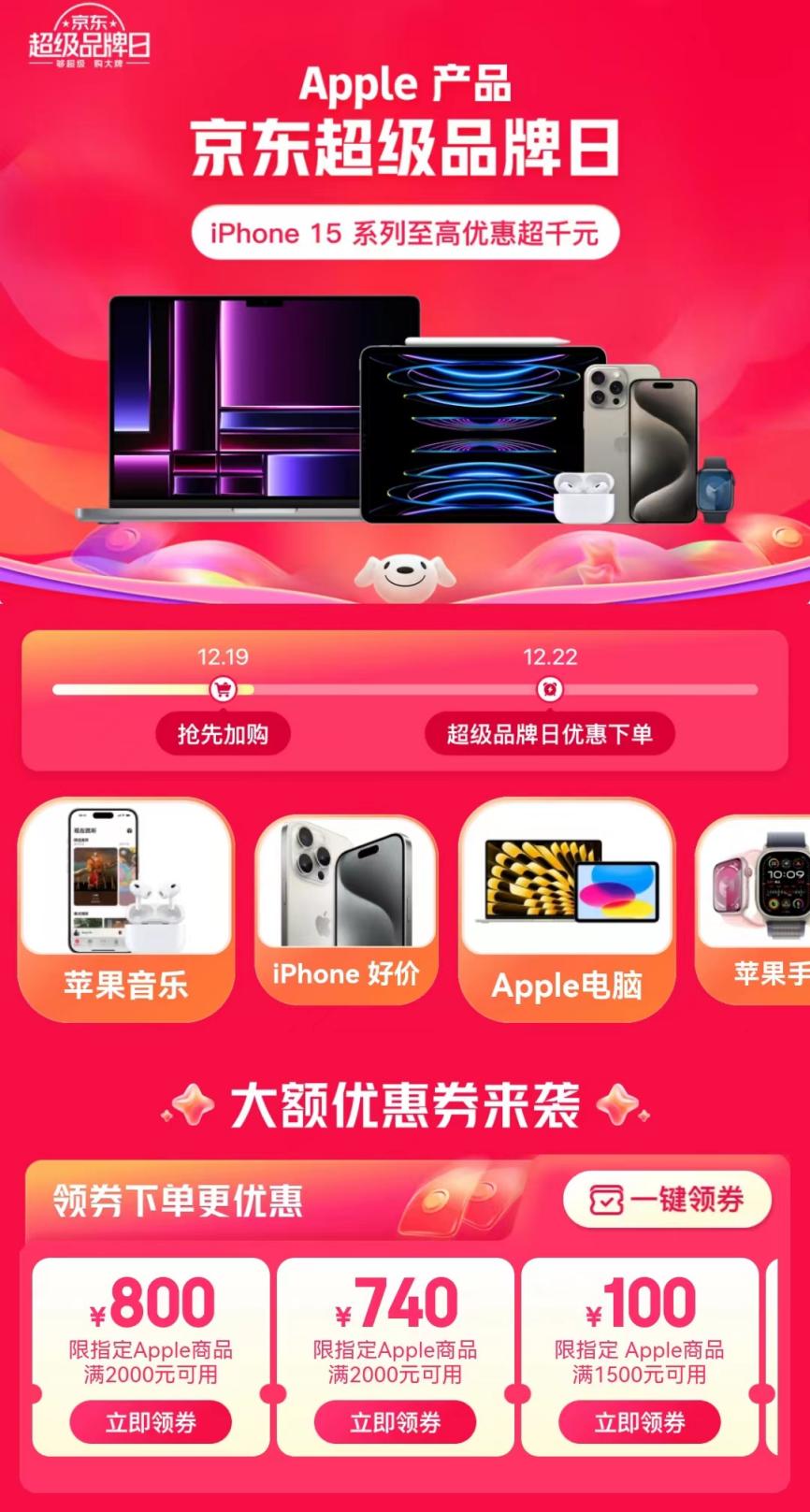 12月22日,打开京东APP搜索“苹果超品”即可进入Apple产品京东超级品牌日会场,领取对应优惠券、购买超值产品。