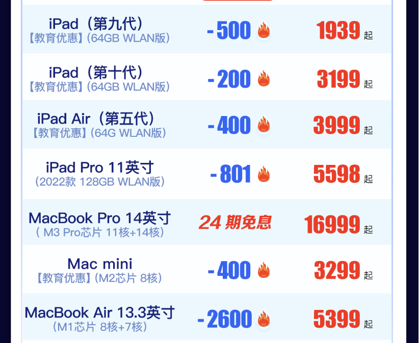 Apple产品京东超级品牌日也是入手iPad和Mac产品的好时机,iPad(第九代)64GB WLAN教育优惠版限时优惠500元,iPad(第十代)64G WLAN教育优惠版限时优惠200元,iPad Air(第五代)64G WLAN版教育优惠版限时优惠400元,iPad Pro 11英寸 2022款 128G WLAN版限时优惠801元。MacBook Air 13.3英寸 M1芯片 8核+7核限时优惠2600元,Mac mini M2芯片 8核教育优惠版限时优惠400元,MacBook Pro 14英寸 M3 Pro芯片 11核+14核可享24期免息。