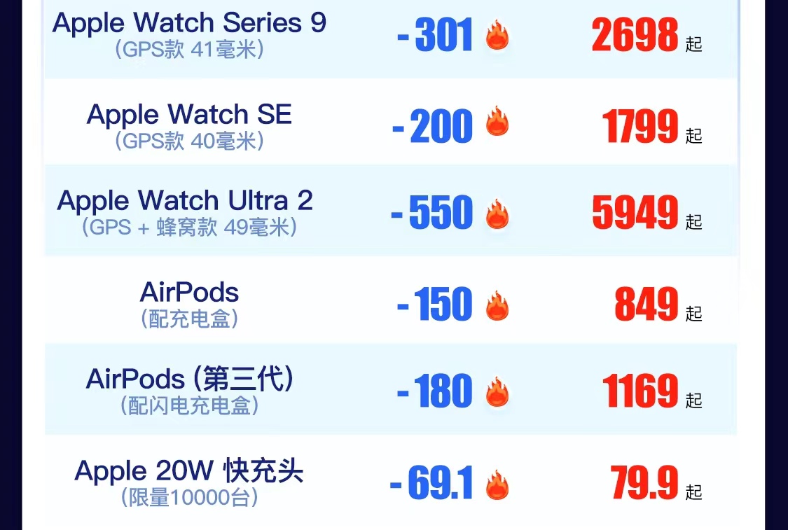 此外,Apple产品京东超级品牌日还有Apple Watch、AirPods等产品优惠可享。其中,Apple Watch Series 9 GPS款 41毫米版京东价2698元;Apple Watch SE GPS款 40毫米版京东价1799元;Apple Watch Ultra 2 GPS+蜂窝款 49毫米版京东价5949元。此外,AirPods配充电盒版京东价849元,AirPods(第三代)配闪电充电盒版京东价1169元;Apple 20W快充头限时限量享优惠,京东价79.9元。
