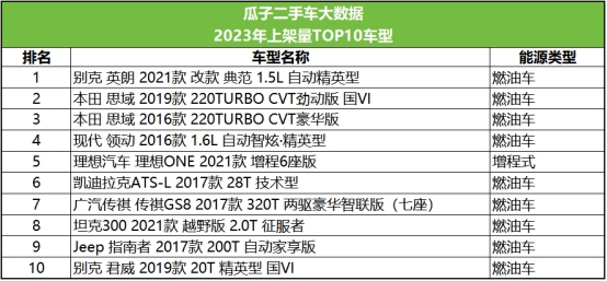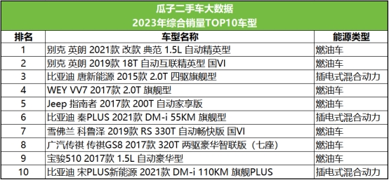 综合看2023年瓜子二手车平台整体销量,销量前10的热销车型中,新能源车型就上榜三款。其中,比亚迪唐新能源力压许多传统的热门燃油车型,挤入销量榜前三,并成为瓜子二手车平台销量最高的新能源车型;而另外两款上榜的新能源车型也皆为比亚迪品牌。此外热销前10的车型中,一半为自主品牌,“国产力量”在我国消费者中的认可度稳步攀升。