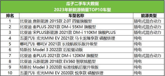 2024年的新能源市场将迎来一轮新的爆发,这也预示着新能源换车潮即将来临。届时大量二手新能源车将进入市场,如何挑选是个难题。根据瓜子二手车2023年新能源车型销量榜单,最受市场认可的10款二手新能源车型如下。