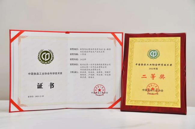 2023“全国食品工业科技进步工作会议暨中国食品工业协会科学技术颁奖大会”于南京国际博览会议中心隆重召开。认养一头牛集团牵头主导的“数智化A2型奶牛选育与A2 β-酪蛋白乳制品开发及产业化应用”项目获得“中国食品工业协会科学技术奖”2022年度二等奖。