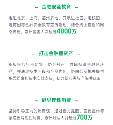 在线上,奇富科技亦推出多渠道金融知识宣讲和金融安全教育,包括线上直播普及反诈知识、在App内展示主题宣传海报、发行反诈知识长图、分享反诈案例和监管风险提示,有效地利用社交媒体来扩大教育的影响力。在产品端,奇富科技在其旗下官方App上线“消费者权益保护”专栏,开设法律法规、知识普及、以案说险专区。与此同时,奇富科技还积极倡导理性消费,坚持引导正向的消费观,通过官方提醒、营销宣传等渠道倡导理性消费,累计覆盖人次超过700万。