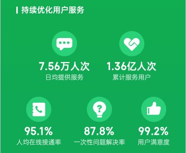 在产品服务方面,奇富科技面向公众开启投诉直通热线,快速有效协商客户诉求,并根据用户反馈和主动发掘,推动110项流程优化。据《年报》数据,奇富科技已累计服务用户1.36亿人次,2023年日均提供服务7.56万人次,人均在线接通率95.1%,一次性问题解决率87.8%,用户满意度99.2%。