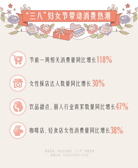 3月7日,抖音生活服务发布了“三八”节女性消费观察数据,展现平台购物趋势及女性消费偏好。数据显示,2月28日至3月5日,节前一周女性消费颇为活跃,平台相关消费量同比增长达118%。