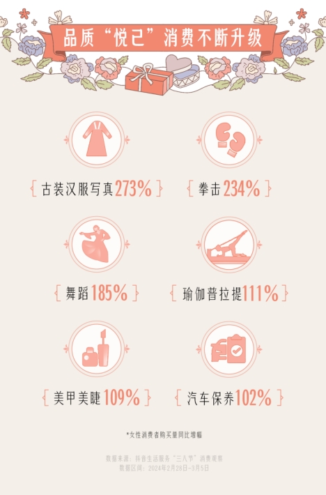 “悦己消费”近年不断升级,丰富多元的商品供给,满足不同消费者的品质购物需求。“三八”节前,有的消费者选择在春日体验汉服装造、拍国风写真,相关商家商品销量同比增长了273%;有的下单美甲美睫,商品销量同比增长109%;还有不少女性消费者为自己的私家车做养护,汽车保养类商品销量同比增长102%。