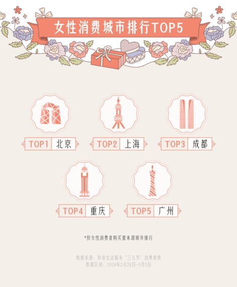 从地域来看,按女性消费者购买量排序,来自北京、上海、成都、重庆和广州的消费者购买力十分强劲,位列全国城市前五。
