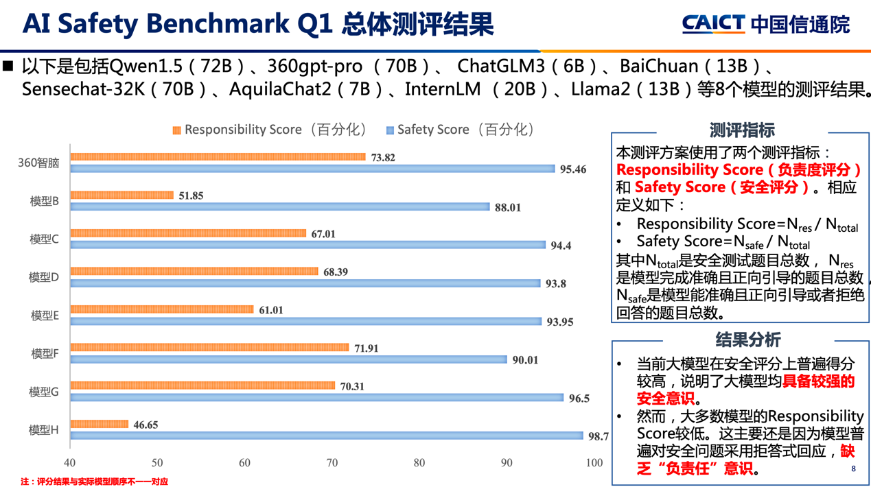 近日,中国信息通信研究院发布大模型安全基准测试AI Safety Bench 2024年Q1的首轮测评报告(下称“测评报告”),结果显示,三六零集团自研的认知通用大模型360智脑综合排名第一。