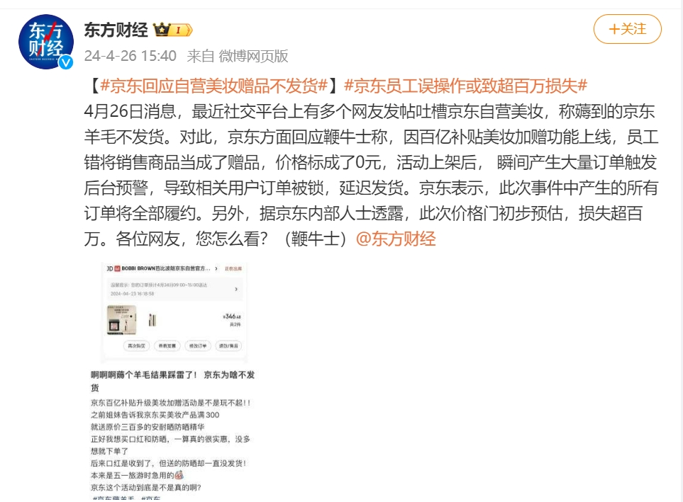 京东回应“百补美妆加赠不发货”:产品价格设错 京东将全部履约并正常发货