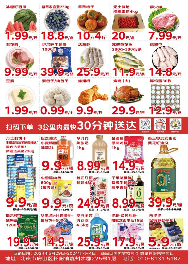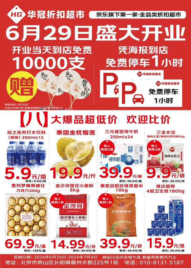 华冠折扣超市开业6月29-30日两天营业时间早8:00-晚21:00,6月29-7月4日,甄选八款超低价爆品,挑战全网比价。其中包括低至5.9元/组,共12瓶的冠之选苏打水饮料;每斤仅需19.9元的泰国金枕榴莲;300g装费列罗榛果威化巧克力仅需69.9元;国民牛奶大品牌三元的屋型纯牛奶,低至39.9元/箱;三全猪肉大葱、猪肉白菜两种口味的水饺,2kg装均只要9.9元/袋;还有14.99元/袋、5kg装的金沙河雪花小麦粉,39.9元/袋、10kg重的粟美安稻珍珠常香米,15.9/提的维达超韧4层卫生纸。