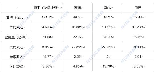 业内认为,今年以来,通达系公司单票收入分化明显。相比之下,中通快递、圆通速递与申通快递、韵达股份的单票收入拉开了一定差距。相比韵达股份和申通快递,圆通速递单票收入降幅相对较低,说明圆通速递虽然参与价格战,但并不完全以份额为导向,采取了平衡收入与份额的策略,中通快递则直接提出宁舍市场份额也“不做亏本快件”。