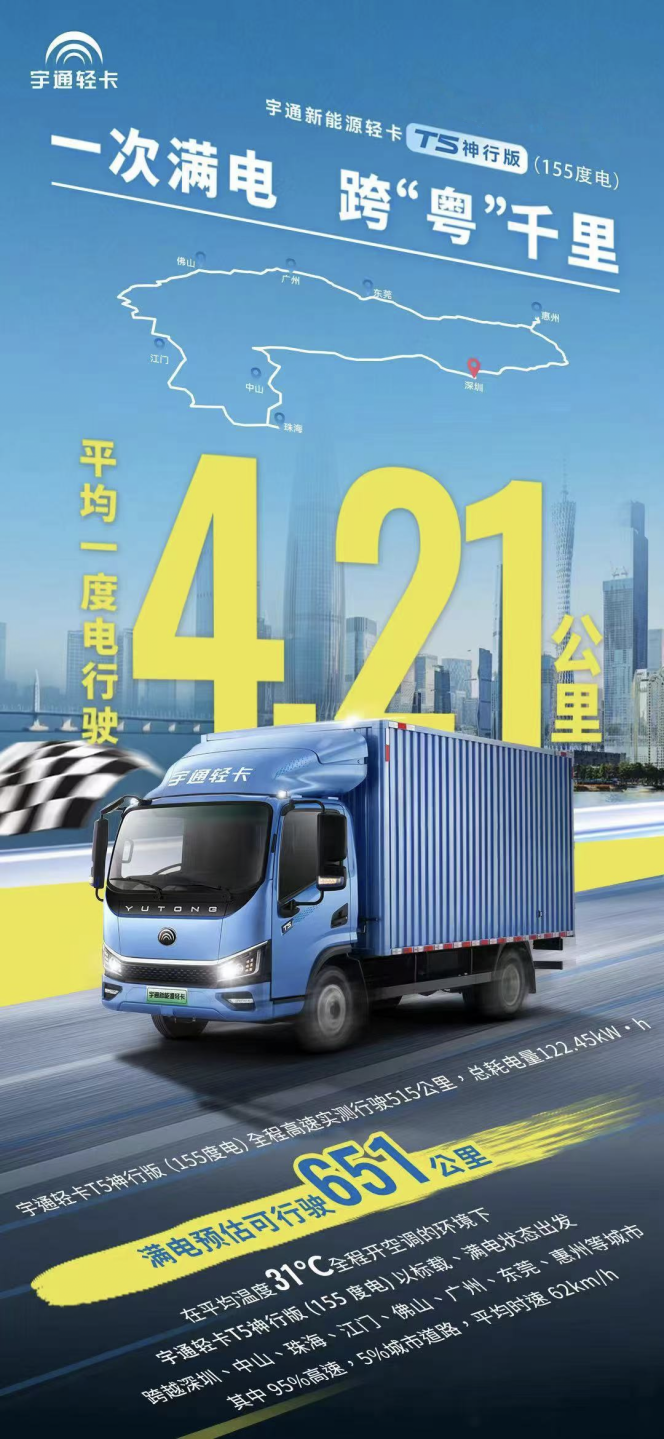 不过在今年3月,宇通以520.46公里创下“电动厢式轻卡单次满电行驶最远距离”吉尼斯世界纪录后,不少用户的想法有了变化。而让人没想到的是,短短几个月,这一上限再次被打破了。8月3日,全新发布的宇通新能源轻卡T5神行版,从深圳出发,途径中山、珠海、江门、佛山、广州、东莞、惠州,再回到深圳世界之窗,实车、实路、实货、实速,全程开空调,最终耗电80%,行驶515公里,一次满电能行驶600公里以上,续航真正提升至堪比油车的“千里级”。在行业内纯电轻卡电量多在120度的情况下,首次将电池容量提升到155度,意味着用户可以放心地将运距从城配拓宽至省际,真正改变了新能源商用车物流运输的格局。