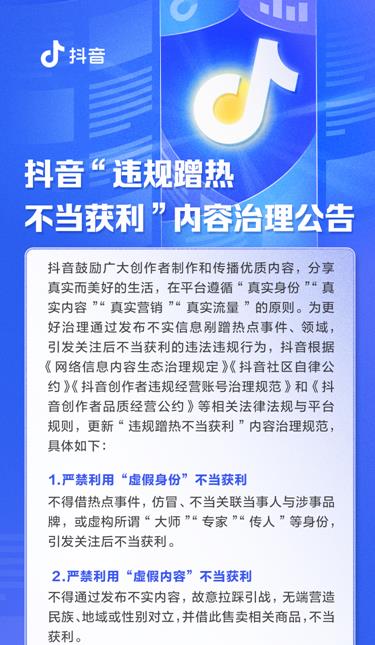 针对极个别账号试图通过发布不实信息、剐蹭热点不当获利的行为,抖音官方账号近日发布治理“违规蹭热不当获利”言行的最新规范。