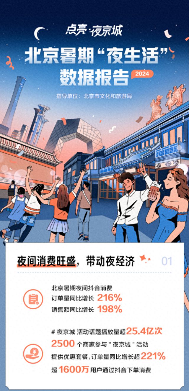 “夜京城”直播背后,是活跃的夜生活和夜间消费。这个暑假,夜间文娱活动多元,欧洲杯、奥运会等运动盛事集中,不断掀起观赛经济、夜间消费热潮。在北京市、各区商务局的指导下,抖音生活服务发起“点亮·夜京城”活动,抖音生活服务数据显示,6月5日至6月30日的首期活动中,参与活动商家订单同比增长176%。《报告》显示,6月1日至8月15日,#夜京城 话题播放超25.4亿次,2500个商家提供优惠套餐,超1600万用户消费。商家销售额、订单量均同比增长超221%。