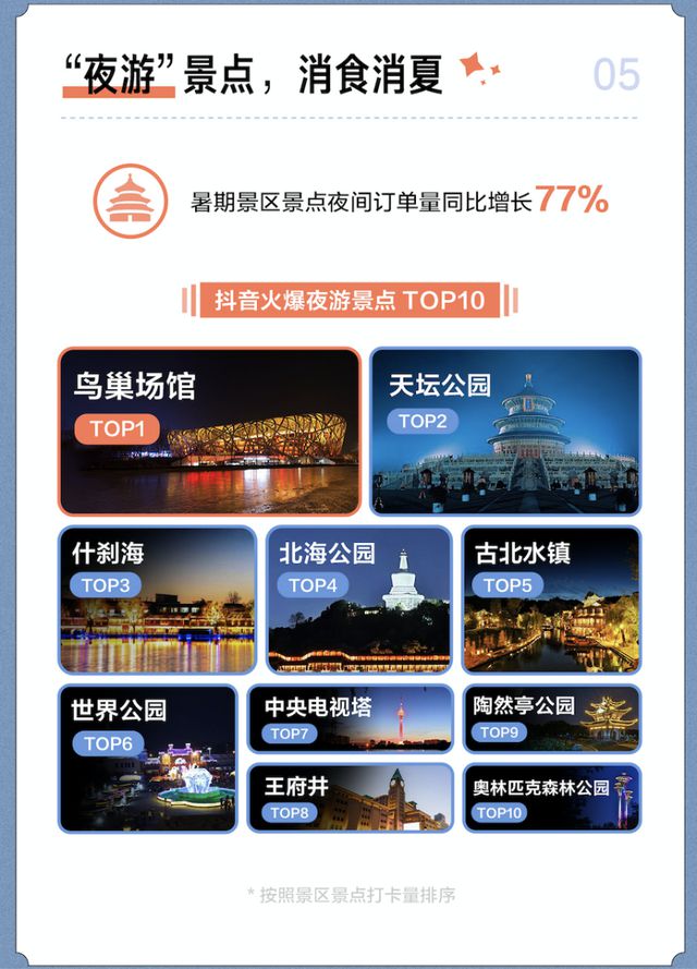 夜间消费,大家最关注什么?《报告》显示,“夜生活”关键词中,地标建筑、酒店、人文古迹、电影院、美食、公园广场等最受关注。夜游景区景点,是很多用户的“夜生活”选项。抖音火爆的夜游景点是鸟巢场馆、天坛公园、什刹海、北海公园、古北水镇等。“夜食”“夜宵”也成为很多用户的选择。受热门赛事影响,烧烤、烤肉成受欢迎的美食品类,其次是小龙虾、火锅、地方菜、快餐小吃。