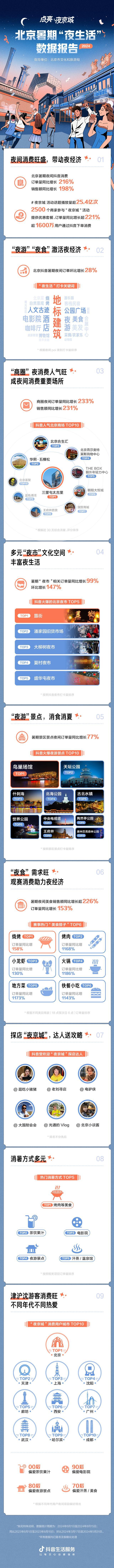 今年暑假,北京夜间消费旺盛,夜经济繁荣。抖音生活服务刚刚发布的《2024北京暑期“夜生活”数据报告》(下称《报告》)显示,6月1日至8月15日,北京市夜间抖音消费订单量(18点至次日6点)同比增216%,销售额同比增长198%。