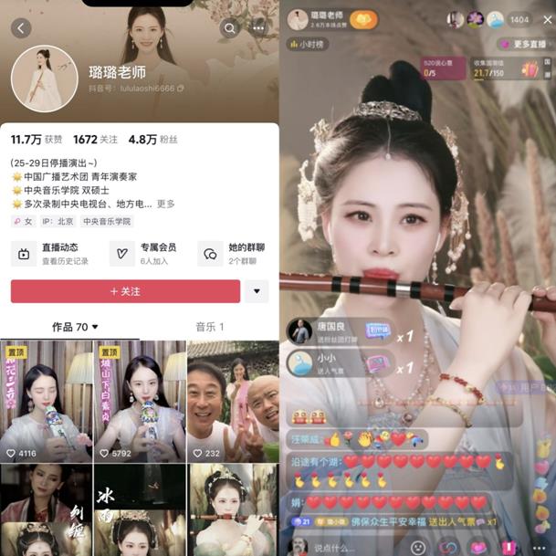 直播拉近了艺术家与观众之间的距离,让院团演员收获了更多线上“铁粉”。团内的青年竹笛演奏家盛璐璐今年 5 月 15 日开始直播,在专业直播运营的建议下逐渐优化直播间布置、演奏选曲和互动技巧,开播至今个人账号吸引 4.8万粉丝关注,总计有226万人观看了她的直播,直播间最高同时在线人数达5000多。