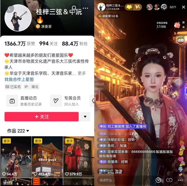 中国广播艺术团与抖音直播此次联合发起的“国艺正当潮”线上比赛,也为更多文艺从业者提供了展示舞台。来自天津的主播@桂梓三弦&中阮 在此次比赛中获得了器乐专业赛道第三名,在 8 月 29 日的晚会现场与中国广播艺术团中阮演奏家耿慧共同演奏了《醉拳》。“90后”的她是天津河东区音乐大三弦演奏技艺的非遗传承人。为了让这门传承千年的小众技艺被更多人了解,她通过短视频、直播等新媒介创新表演形式,将传统技艺和现代流行元素相结合,把三弦弹出“摇滚风”,让网友们耳目一新。她在南昌万寿宫用三弦弹奏外国流行音乐的短视频点赞量超过400万,直播间里最高在线人数超过23万。