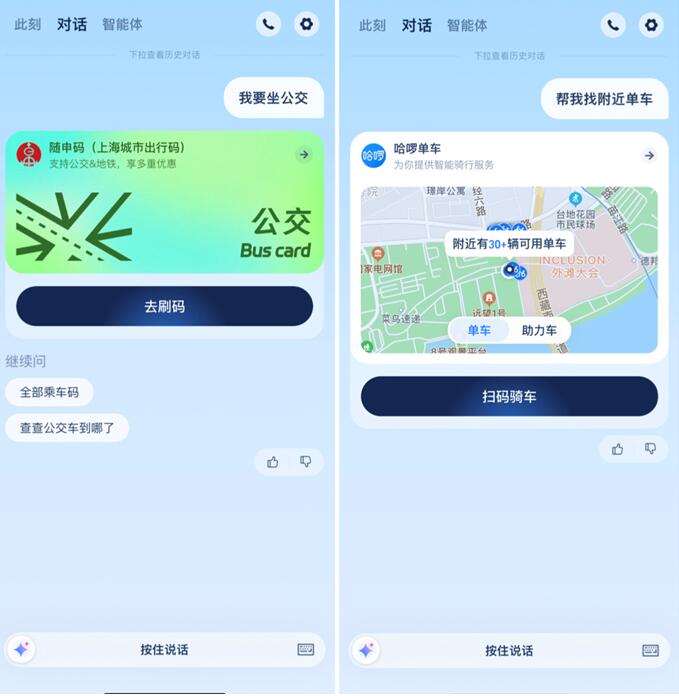 比如针对打工人的通勤场景,就算腾不出手打字,用户也能用一句话唤出地铁码或公交码,还可以轻松找到附近的共享单车;上班路上能按照熟悉的口味,让AI买一杯咖啡或奶茶,到地儿了就能取;下班了懒得打字,可以动动嘴就打车回家,或是搜罗附近推荐的餐馆、电影院等。