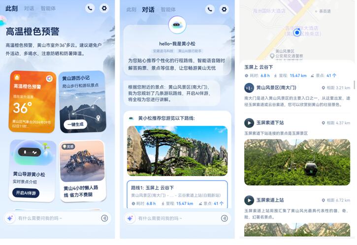 如今年9月,安徽的黄山风景区宣布携手支付宝,打造国内首个“全程AI伴游”景区。当外地游客抵达黄山后,打开“支小宝”就能快速进入黄山空间智能体——通过AOI(Area of Interest)技术,它能根据用户的实时位置介绍当前景点,图文并茂地导航或示范怎么拍打卡照;此外,它还能提供攻略推荐、快速购票、查询附近餐馆及充电宝等服务。