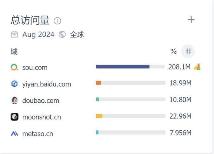 近日,独立AI产品榜单“AI产品榜(aicpb.com)”8月榜单更新发布,三六零(下称“360”)公司旗下360AI搜索用户访问量位列国内总榜第二名、全球搜索引擎榜第三名。结合Similarweb公开数据,2024年8月份,360AI搜索用户访问量已超2亿,是Perplexity AI三倍以上,蝉联全球最大的AI原生搜索引擎;月独立访客量(UV)超8000万,远超国内一众AI产品;并以113%的月增速,成为全球增速最快的规模以上AI搜索引擎。