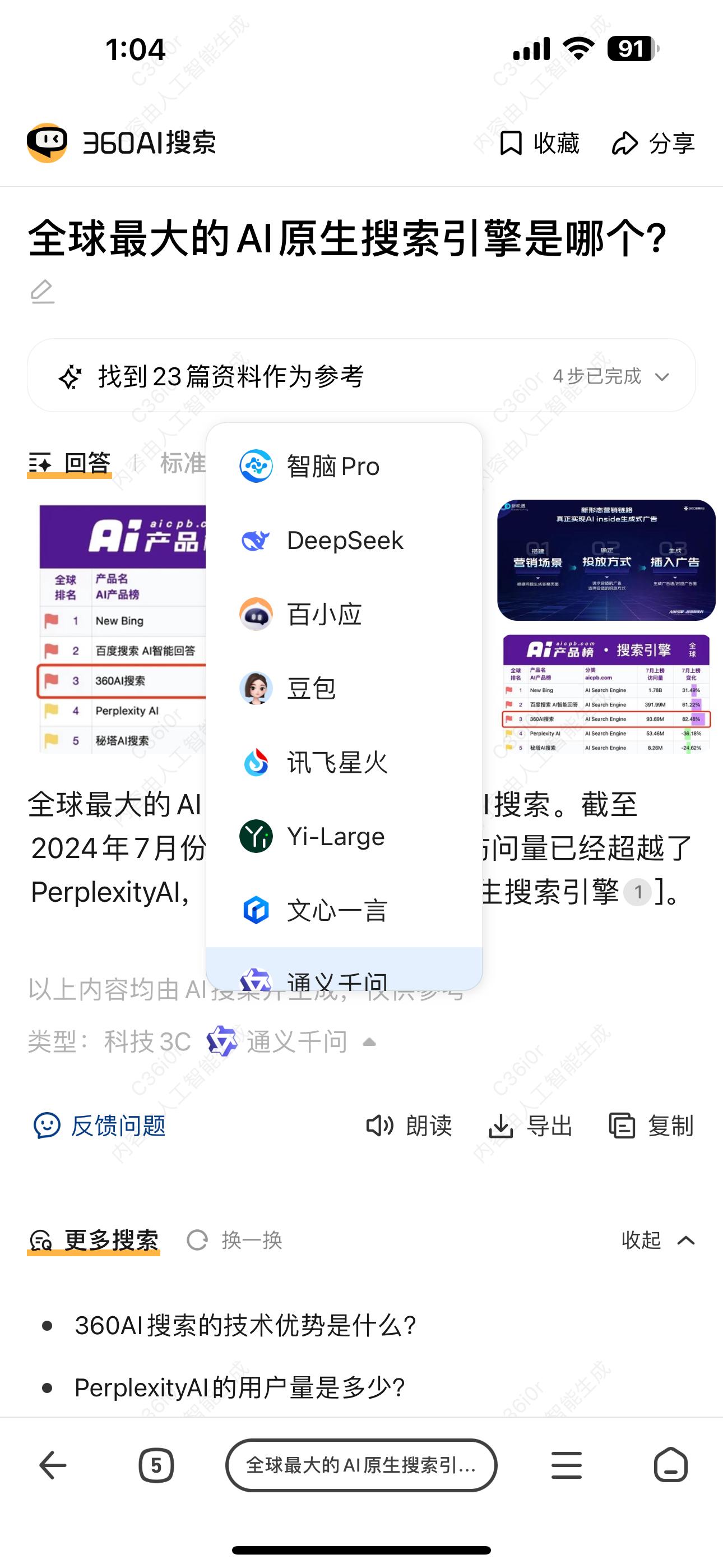 与传统搜索引擎不同,作为AI原生搜索引擎的360AI搜索基于公开网络、知识库、大模型三大支柱。借助首创的CoE技术架构,360AI搜索整合了国内主流的16家厂商51款大模型,支持用户自选切换和系统自动匹配最佳模型,这使得360AI搜索获得了独一无二的技术优势。除了通用大模型,360AI搜索还配备了众多搜索场景专用模型,精准提升特定场景下的搜索质量和体验。