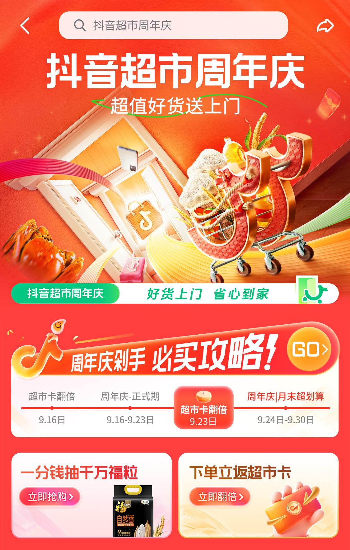 金秋9月,抖音超市成立两周年,恰逢中秋佳节,为回馈广大用户,将推出“超值好货送上门”等系列福利活动。9月16日至23日,用户进入抖音商城,点击抖音超市频道,即可参与抽奖。整个9月,抖音超市还将推出返超市卡、老用户100元感恩回馈红包等惊喜,活动覆盖食品生鲜、厨房家居、数码家电、美妆个护等超多日常百货、家庭必备好物。