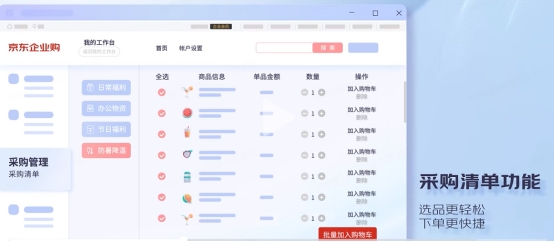 在采购计划编制环节,京东企业购可提供用于计划性、预算制采购场景的清单管理和选品提效工具,按照采购计划自主添加商品,按照不同采购预算、采购场景等自定义清单主题和分类,实现高效选品和采购管理。