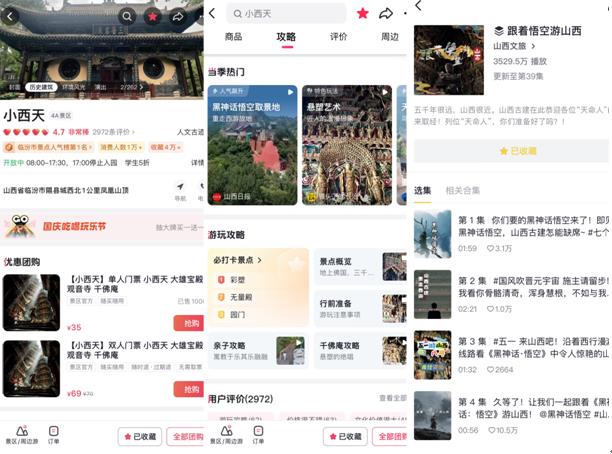 抖音里的“跟着悟空游山西”系列合辑,不断创作优质内容向网友介绍玉皇庙、铁佛寺、悬空寺等景区,合辑播放量超3500万。山西的名胜古迹则吸引着不少文旅探店达人以短视频形式做出细致讲解,进一步提升了山西文旅的知名度和影响力。数据显示,8月20日至9月24日,山西游戏相关景区抖音销售额同比增长403%,订单量同比增长118%。