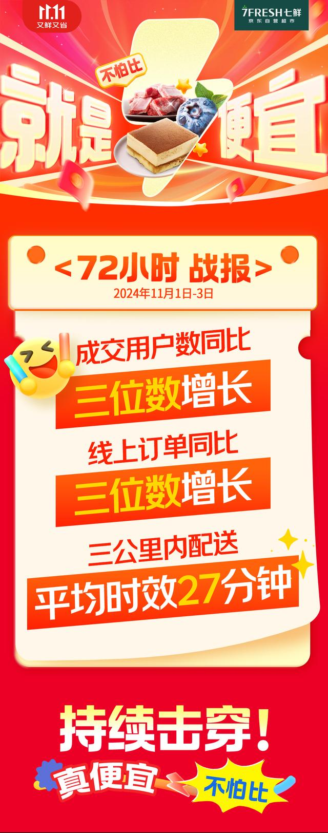 11月1日,京东七鲜超市正式开启的“超级击穿”活动,以“真便宜不怕比”的极致低价成功吸引海量消费者参与。仅72小时,线上订单数、成交用户数均实现同比三位数增长,水果、蔬菜、水产、肉禽蛋等多品类的爆款卖至脱销。