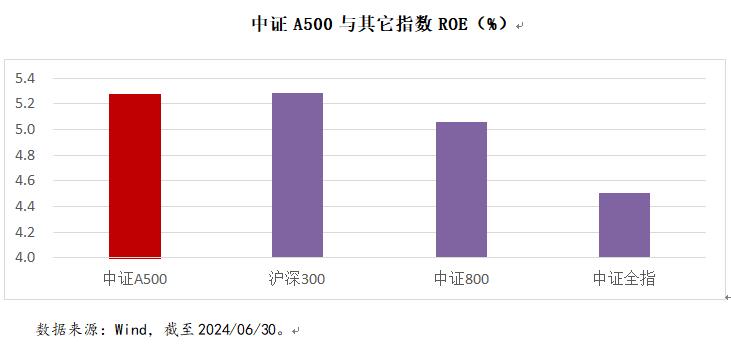 从基本面来看,截至2024年中报,对比宽基指数成分股ROE水平,中证A500指数长期的盈利能力较为突出。