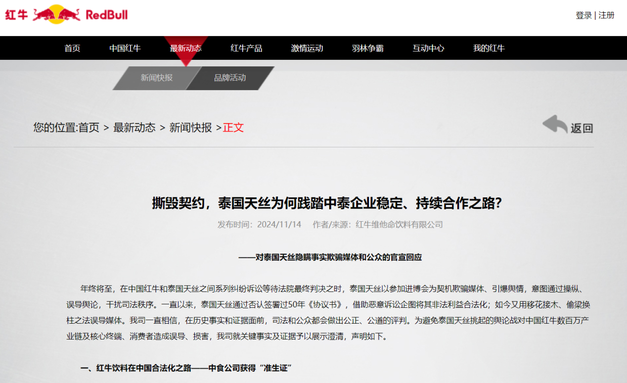 年终将至,在中国红牛和泰国天丝之间系列纠纷诉讼等待法院最终判决之时,泰国天丝以参加进博会为契机欺骗媒体、引爆舆情,意图通过操纵、误导舆论,干扰司法秩序。一直以来,泰国天丝通过否认签署过50年《协议书》,借助恶意诉讼企图将其非法权益合法化;如今又用移花接木、偷梁换柱之法误导媒体。我司一直相信,在历史事实和证据面前,司法和公众都会做出公正、公道的评判。为避免泰国天丝挑起的舆论战对中国红牛数百万产业链及核心终端、消费者造成误导、损害,我司就关键事实及证据予以展示澄清,声明如下。