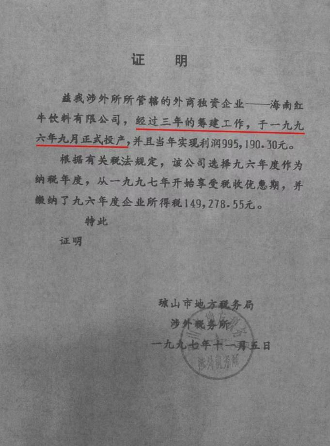 1993年许书标先生在海南合资设立的海南红牛饮料有限公司的营业执照中,注明该公司的经营范围为“红牛饮料的生产与销售(凡涉及行政许可的项目凭许可证经营)”。1994年11月1日,海南红牛向海南省产品质量监督检验所提出“红牛饮料产品标准”(共10种成份),但1995年3月13日卫生部批复仅批准了5种成份并要求降低使用量,且不含红牛饮料所必须的“牛磺酸”,不具备“红牛饮料产品标准”所要求的成分和含量。许先生的红牛饮料无法在中国获得生产。事实上,根据海南省琼山市地方税务局的证明,海南红牛1996年9月接受中国红牛委托加工前,在中国不能生产红牛饮料。
