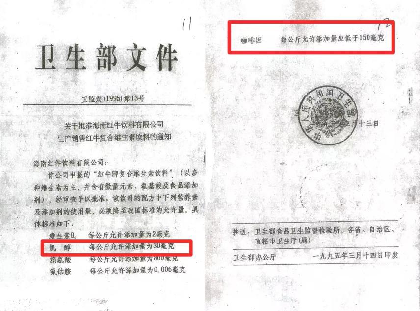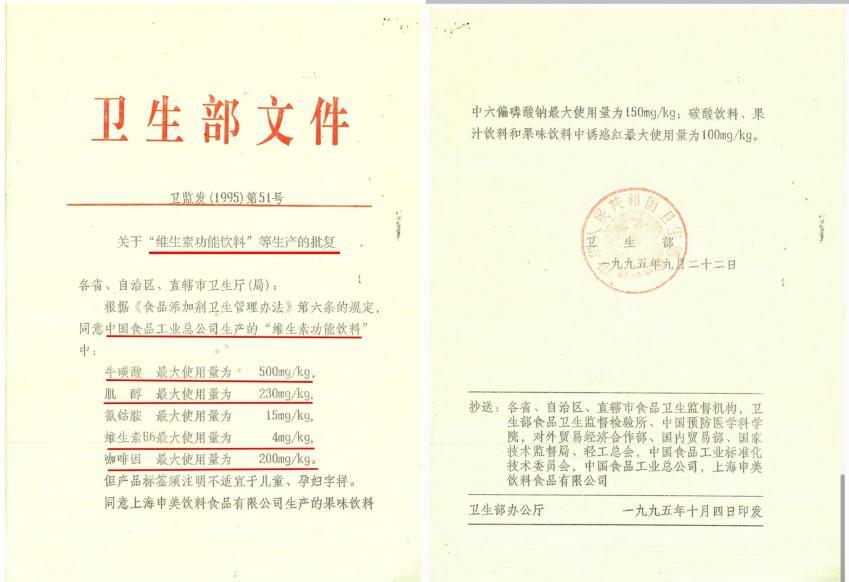 1995年3月,许书标先生和华彬集团严彬先生合作后,严彬找到中国食品工业总公司、深圳中浩集团合作。1995年3月29日,中食公司向卫生部申请“维生素功能饮料”营养素含量行政许可批文。1995年9月22日、卫生部针对中国食品工业总公司作出的批复(卫监发[1995]第51号),“同意中国食品工业总公司生产的‘维生素功能饮料’中牛磺酸最大使用量为500mg/kg、肌醇最大使用量为230mg/kg、氰钴胺最大使用量为15mg/kg、维生素B6最大使用量为4mg/kg、咖啡因最大使用量为200mg/kg”,后中食公司将此“维生素功能饮料”批文及配方投入到合资公司,此即“合资公司产品”专有名称的来源,一直在中国使用了29年,其成份含量也从未发生过实质变化。