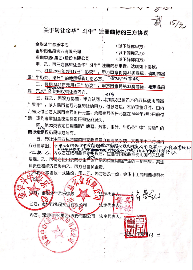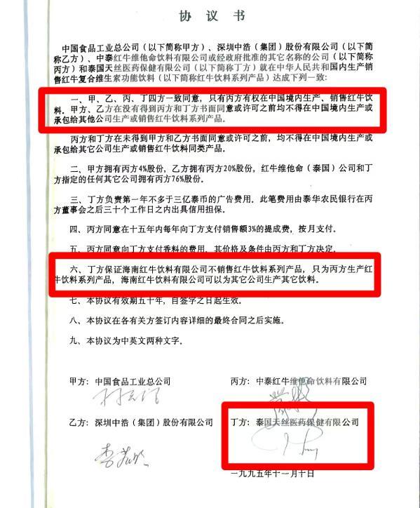 中食公司于1995年9月取得卫生部生产许可批文后,1995年11月10日中泰各方签署有效期为50年的《协议书》,约定只有中国红牛有权在中国生产销售红牛饮料,泰国天丝不能经营红牛饮料,海南红牛只能为中国红牛生产红牛饮料。同年,中泰双方股东签订《95年合资合同》,约定中国红牛产品上的商标是中国红牛的资产。1996年1月,中浩公司购买斗牛商标,解决红牛商标在中国使用和注册的障碍。