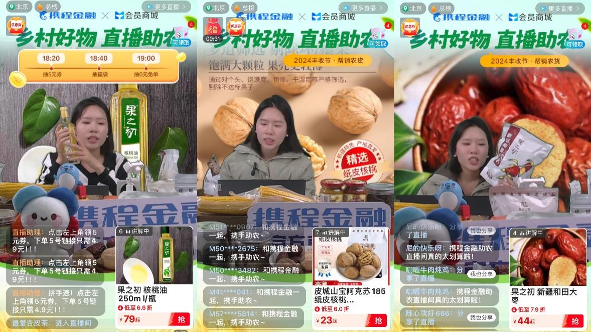 今年9月以来,携程金融陆续开展了数十场以“乡村好物 直播助农”为主题的助农带货直播,优选新疆和田骏枣、四川牦牛牛肉干、东北喜乐掰掰玉米、稻谷粒大米、俏俏果香薯干等数十款特色农产品,通过介绍当地文化、民俗风情等方式,全面展示农特产地方特色优势,拉近与消费者之间的距离,提升直播间热度和销量,其中玉米、红薯干等产品销量靠前。通过助农直播不仅为优质农产品提高知名度、曝光度,也切实推动农民增收和当地特色产业发展。