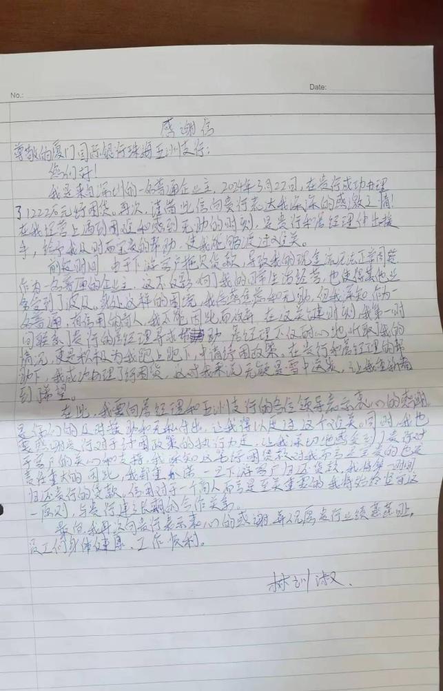 “厦门国际银行的詹经理帮助我成功申请了纾困贷款,这对我来说无疑是雪中送炭,让我重新看到了希望……”日前,厦门国际银行珠海五洲支行收到了一封情真意切的亲笔感谢信,信件中朴实的文字和亲切的话语,无不流露出客户林先生的认可和信赖。