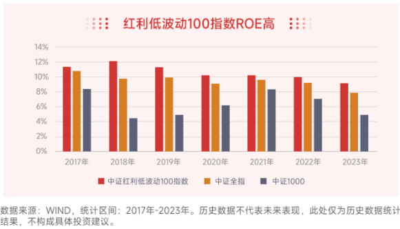 从盈利能力来看,红利低波动100指数成立于2017年5月26日,自2017至2023的7年间,每年年末 ROE 均保持在 9%以上,持续高于基准中证全指,盈利能力较强。