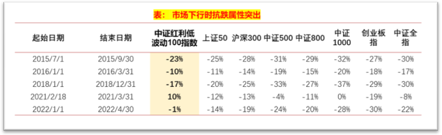 从抗跌性来看,在市场震荡、经济转亏等下行环境下,中证红利低波动100指数表现出较好的防御特性,抗跌性强。Wind数据显示,在2015至2022年的五轮市场下行环境中,该指数较之上证50、沪深300、中证500、中证800、中证1000、创业板指、中证全指等指数回撤均为最低,尤其值得一提的是,在2021年的市场下跌中,仅有中证红利低波动100指数收正,且收益率达10%,而其他指数均未能收正。