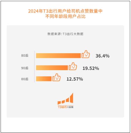 报告显示, 2024年,T3出行用户给司机点赞数量中,80后、90后、00后占比分别为36.4%、19.52%、12.57%,正进入中年的80后拔得头筹,更愿意分享善意。