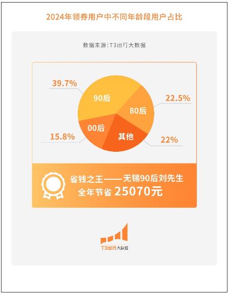 领券用户中,80后、90后、00后的占比分别为22.5%、39.7%、15.8%。其中,90后最爱领券,全年领券超1亿张。同样来自江苏无锡的另一位用户——90后刘先生摘获“省钱之王”称号,全年节省了25070元。